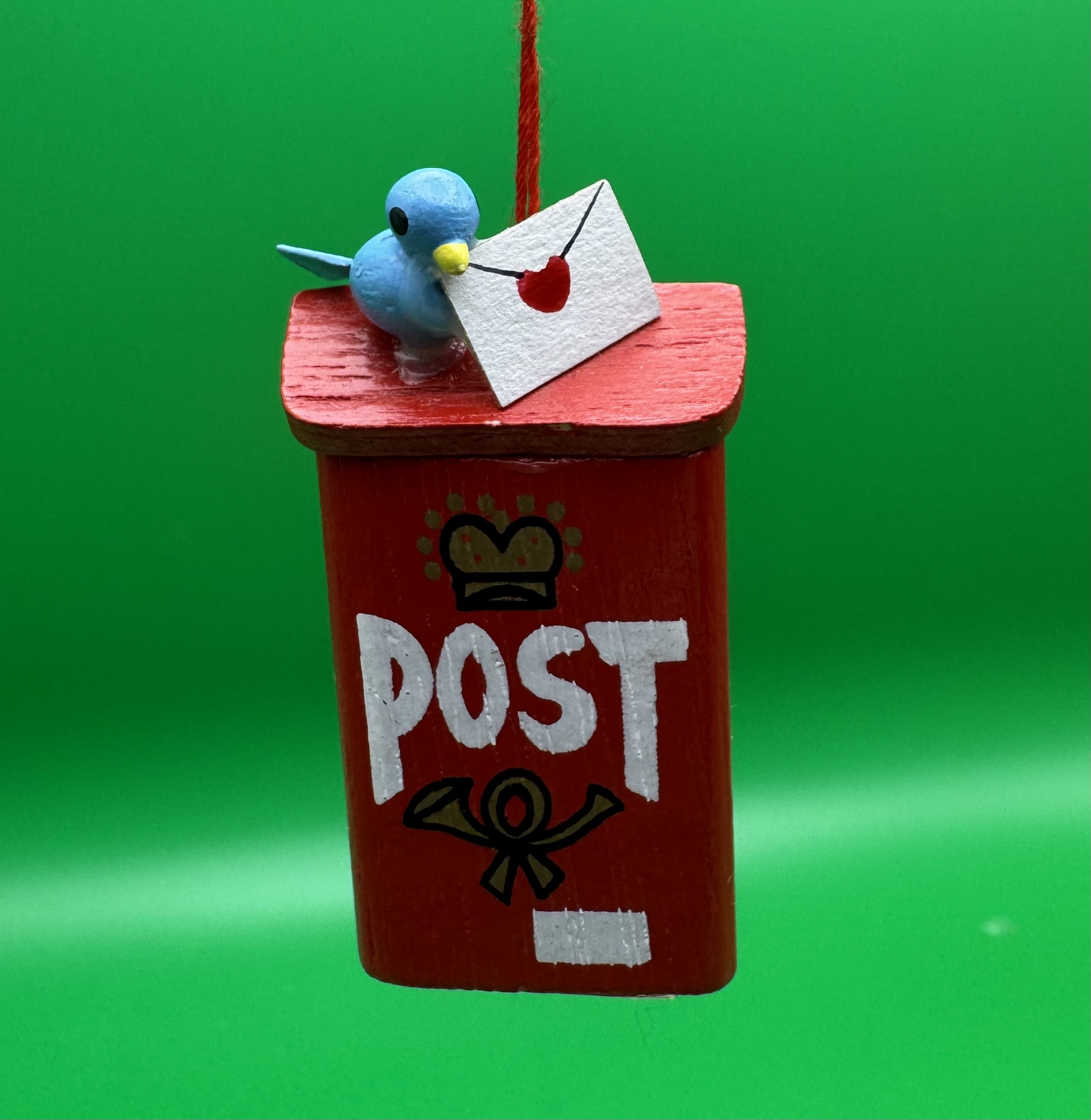 This tiny wooden post box (or mailbox) ornament is another German Christmas Market find. Though that is where we came across it, this is not a German post box. It is a Danish post box. The particular shade of red is from the Coat of Arms of the House of Oldenburg, a line which includes the royal family. This red color was also used for the postmen, making them easily identifiable and also conveying their authority. The crown indicates ties to the monarchy, giving the message that this is an official post box. The horn is emblematic of the official postal service. These elements have been standardized on the boxes since the 1860’s. At one time, these boxes could be found all over the city of Copenhagen, the capital of Denmark. It was hard to find a street that didn’t have at least one. They were also conveniently placed in smaller cities and towns, and were used often. Alas, the red post box is being phased out. Physical letters, cards, etc. have declined about 90% since 2000, with many boxes being little used. Soon the post box will be a relic found mostly in museums. This is a bit sad for many residents of Denmark, and for Layden too. When he was living in Denmark in the late 70’s there was no email, no facetime or Messenger, no texts, and overseas phone calls quite expensive. Sending a letter was economical – in 1977 the cost of a first class US stamp was 13 cents, and an international stamp was 25 cents for the first ounce, going up a few cents as weigh increased. Rates were similar in Denmark, and Layden relied on those red post boxes to keep him connected to family and friends in the USA.