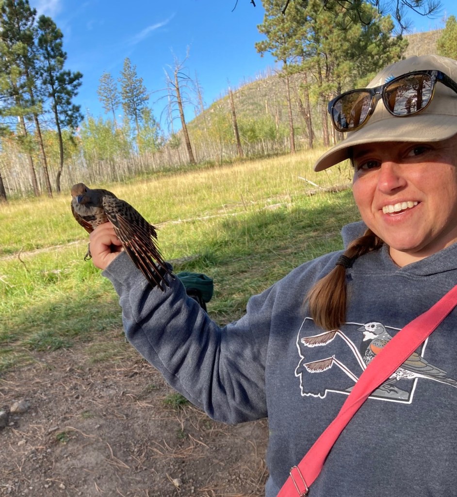 Alicia Bachman, lead bird bander, with a Flicker she has just banded and is ready to release.