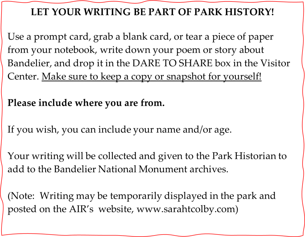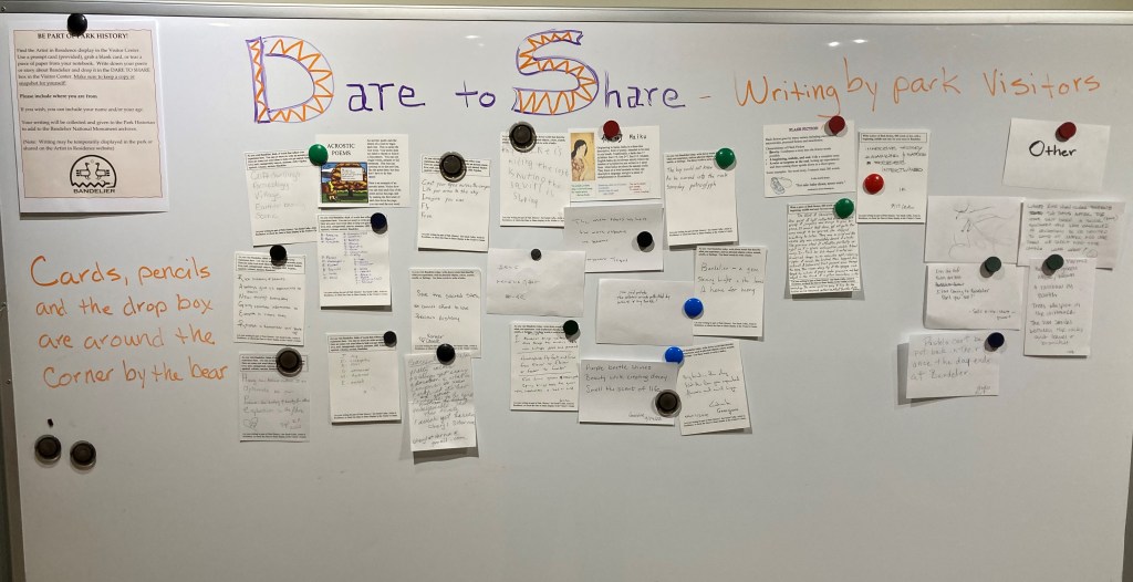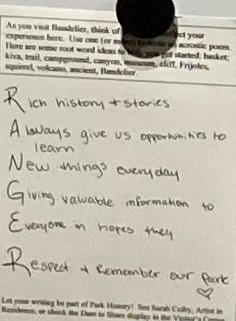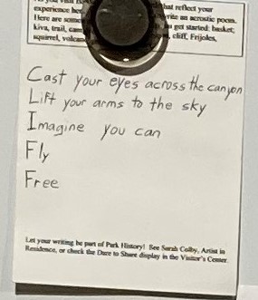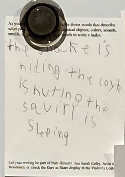 An important component of being an AiR is to have some public-facing activities. One of the things I did was conduct some mini-workshops with park visitors. That was fun. But my favorite thing was to invite people to write something about their time here in the park and then share it. I created some prompt cards that made it easy for them to write micro-fiction or a poem to be shared and displayed in the park. I chose this because I believe that taking the time to write about a place we are in or that we visit adds a dimension that enriches our experiences. Taking pictures with a cell phone or buying a souvenir at the gift shop are good ways to remember a place, but writing connects us in a way that other things do not. Writing invites us to reflect, to think about details, like temperature or the feel of the breeze, that don’t show up in photos. I hope the writing that people did here will become part of their treasured memories, and I also hope that they will want to write more about places they go and things they experience. Here are a few of my favorite submissions: