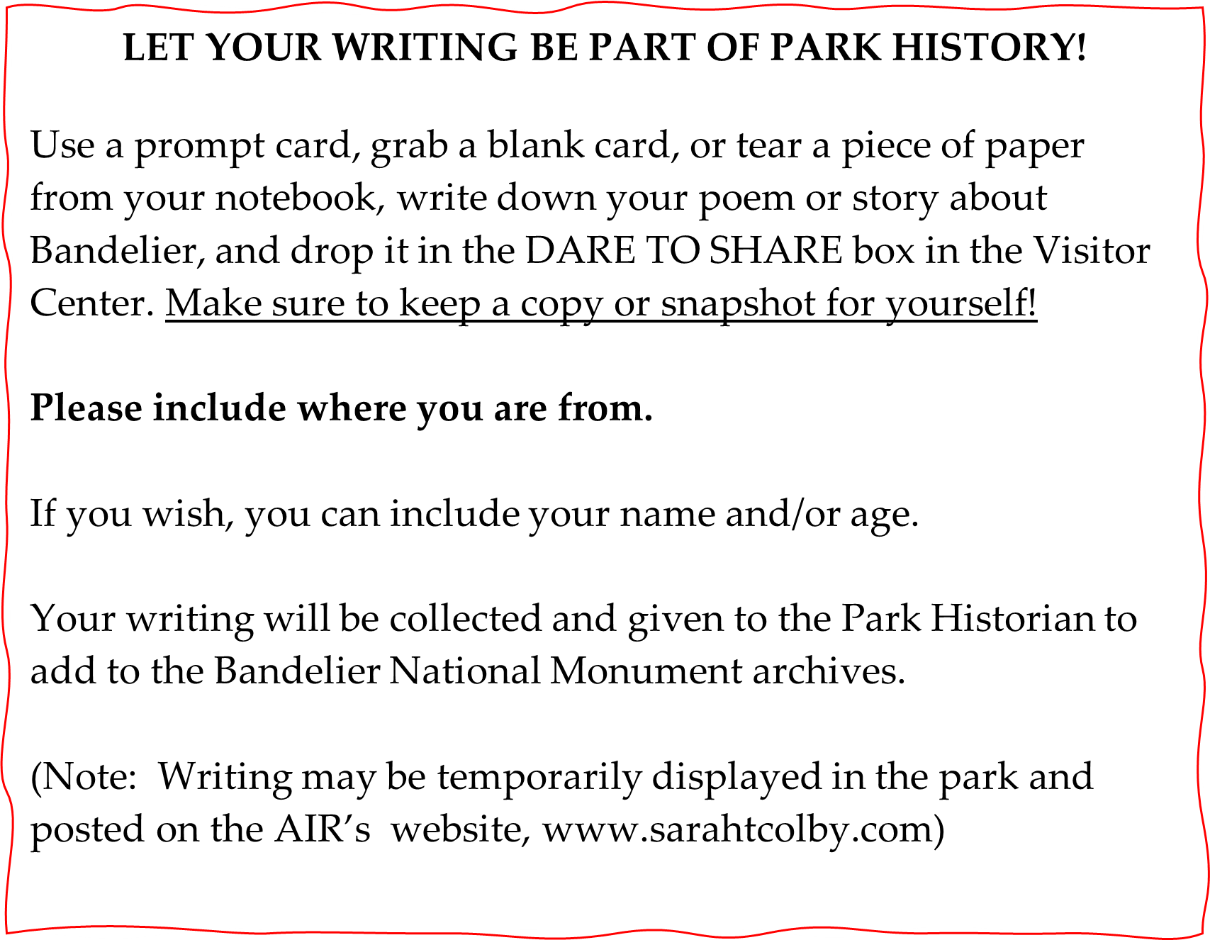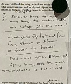 An important component of being an AiR is to have some public-facing activities. One of the things I did was conduct some mini-workshops with park visitors. That was fun. But my favorite thing was to invite people to write something about their time here in the park and then share it. I created some prompt cards that made it easy for them to write micro-fiction or a poem to be shared and displayed in the park. I chose this because I believe that taking the time to write about a place we are in or that we visit adds a dimension that enriches our experiences. Taking pictures with a cell phone or buying a souvenir at the gift shop are good ways to remember a place, but writing connects us in a way that other things do not. Writing invites us to reflect, to think about details, like temperature or the feel of the breeze, that don’t show up in photos. I hope the writing that people did here will become part of their treasured memories, and I also hope that they will want to write more about places they go and things they experience. Here are a few of my favorite submissions: