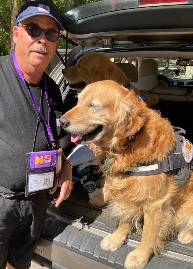 Cooper and Huck are Certified National Crisis Response Canines. Andy and Cooper have recently completed a harrowing assignment to Uvalde, Texas where they assisted in the aftermath of the tragic school shooting at Robb Elementary last May. Thank you Andy and your lovely dogs for the service you render. I hope your experience here brings you respite and a measure of peace.