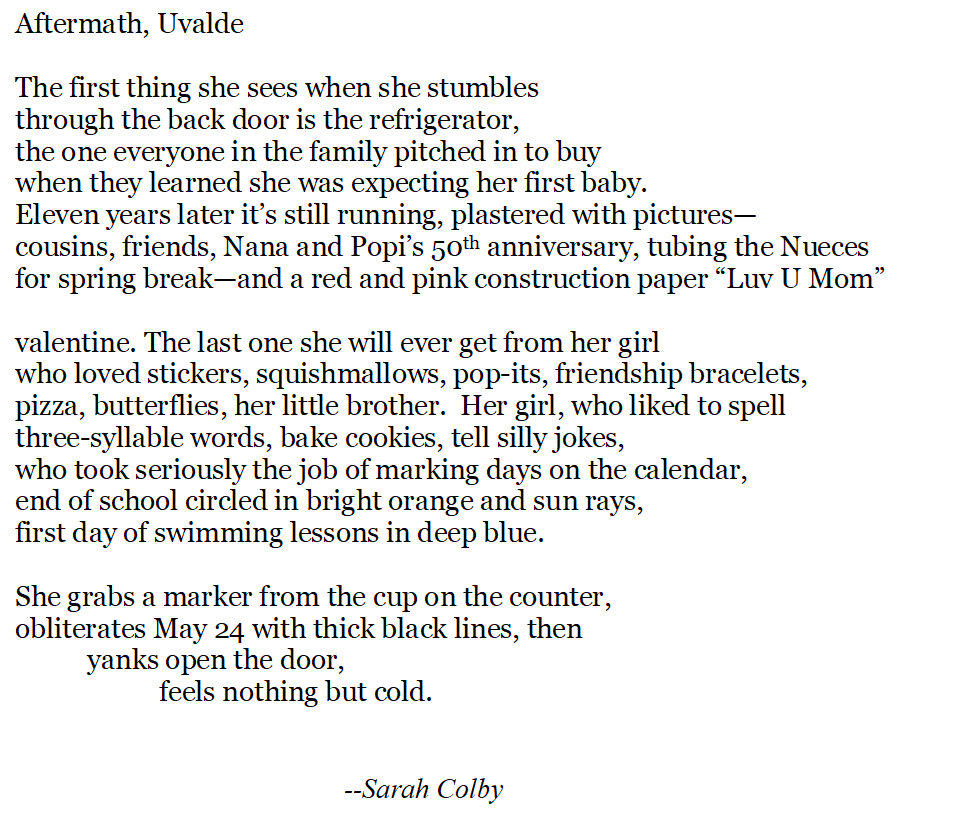 San Antonio, where I am from, is very close to Uvalde. To provide an outlet for our shared grief, the organization Arts Alive San Antonio created a space called Poets Respond to the Uvalde Tragedy. You can find the poem I am sharing here on their site, along with many others, at: https://artsalivesa.com/poets-respond-to-the-uvalde-tragedy-part-7/